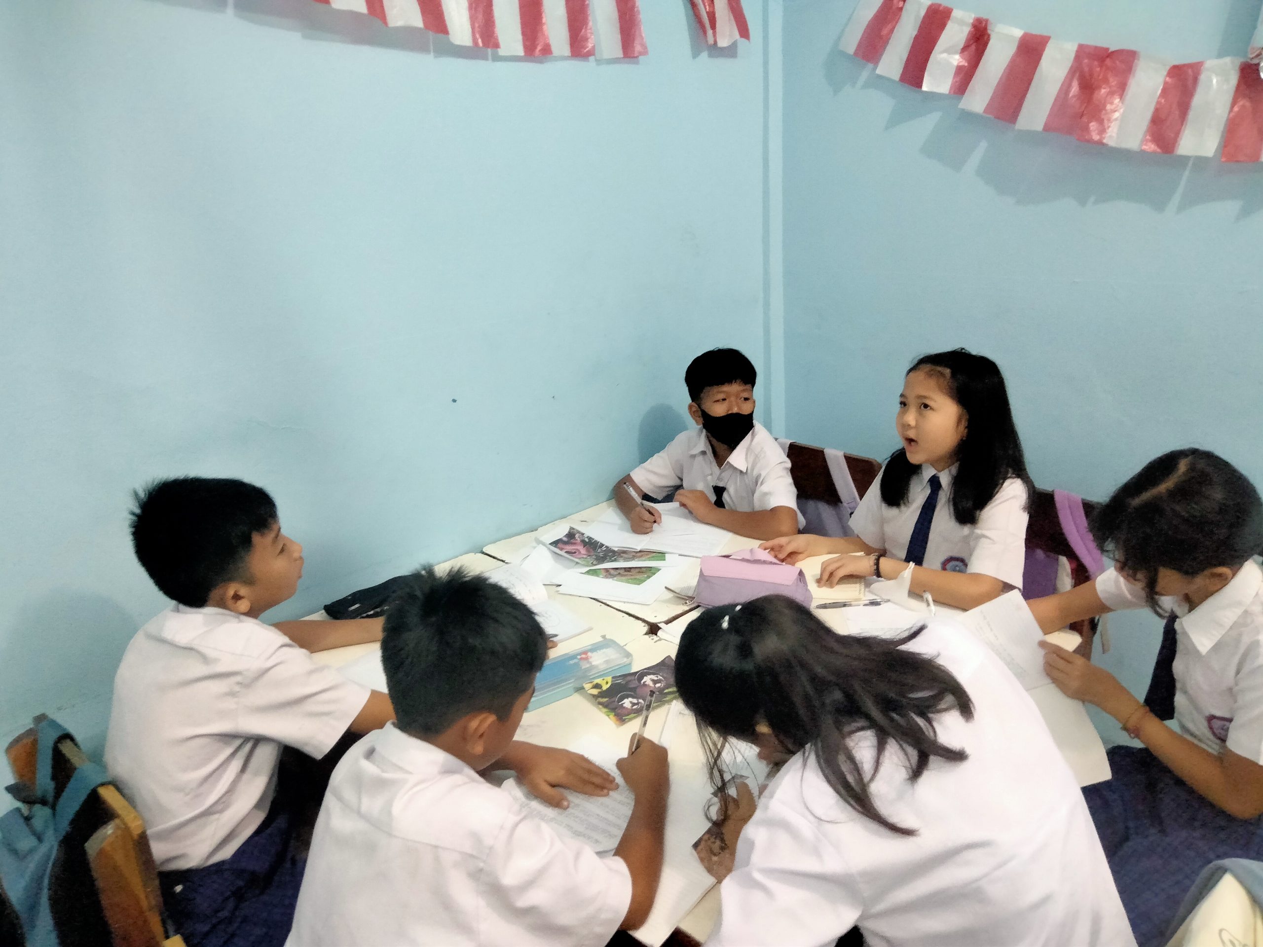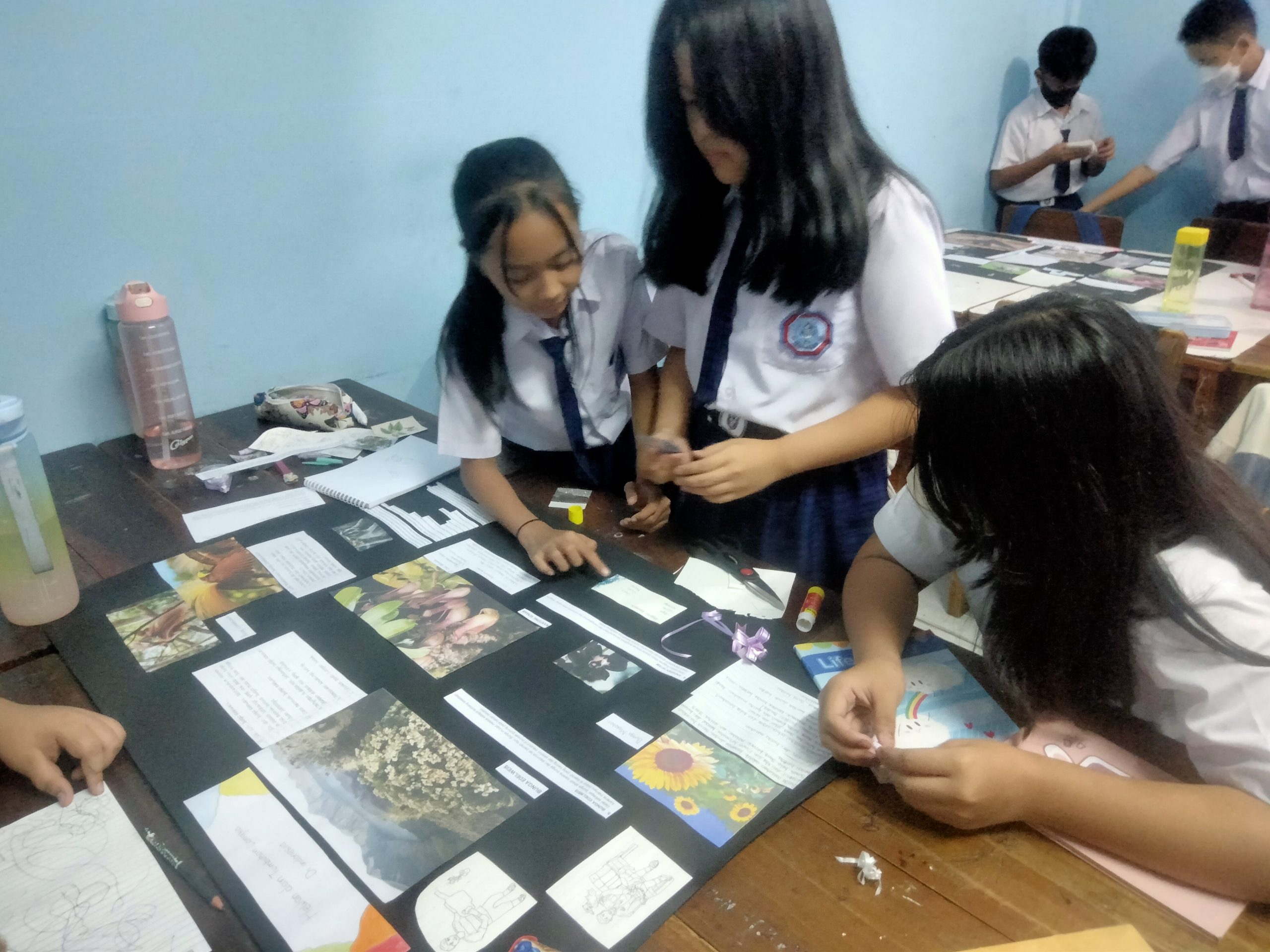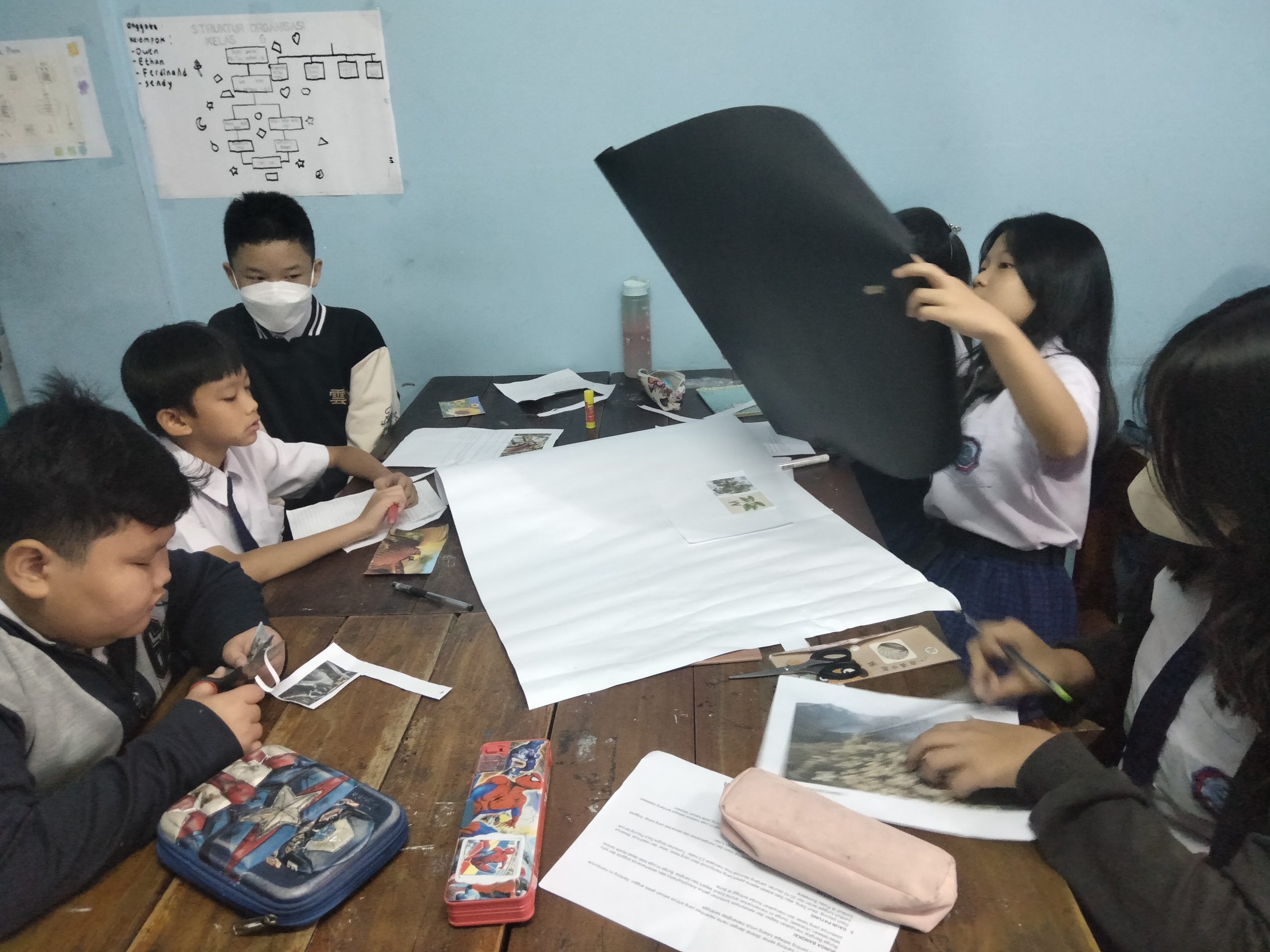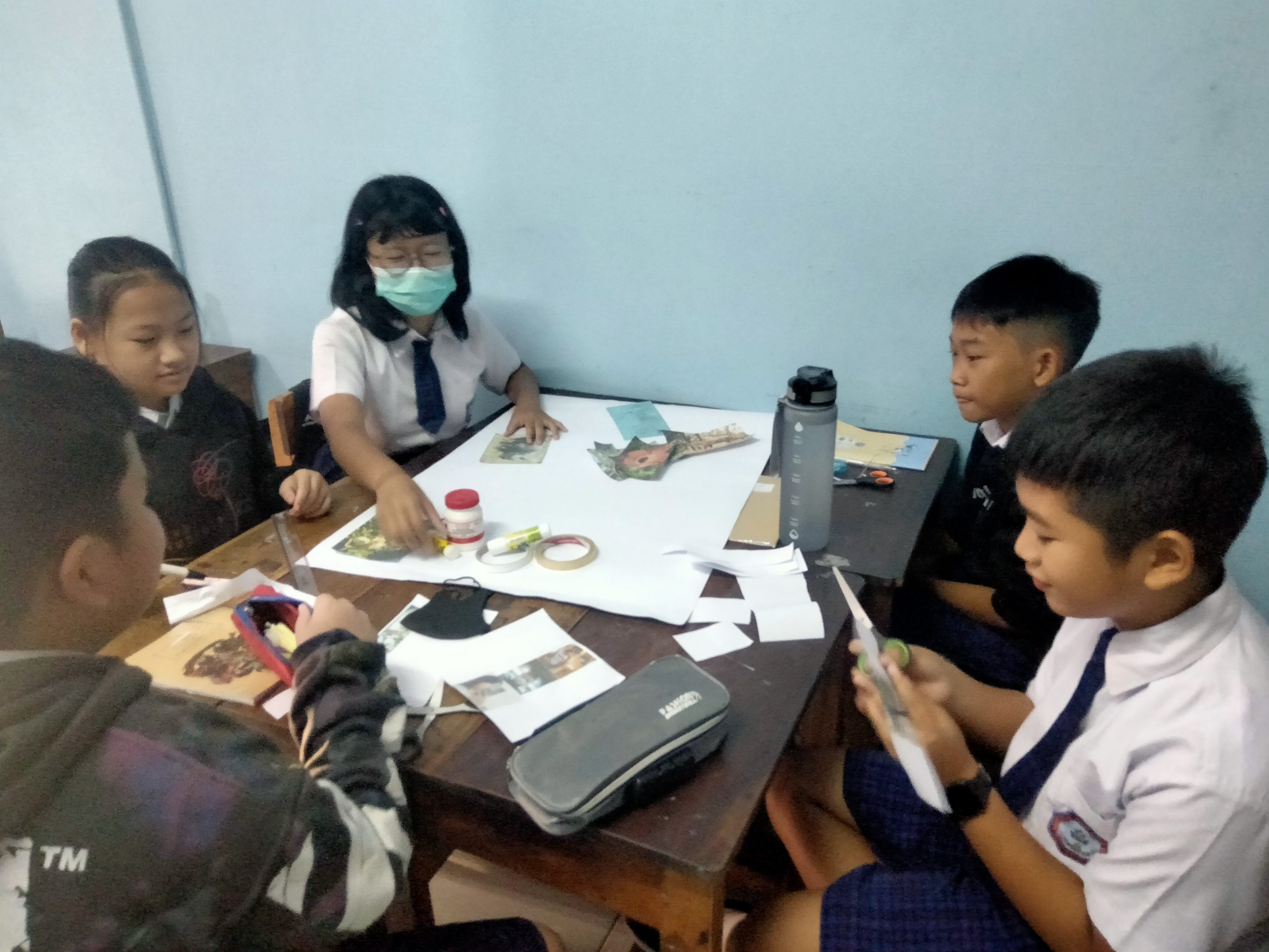 Siswa-siswi membentuk kelompok dan menyiapkan bahan-bahan yang sudah dibawa dari rumah, seperti kertas karton, gambar hewan atau tumbuhan langka, gunting dan lain-lainnya.